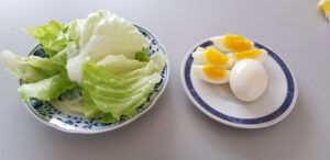 Einige Salatblätter waschen. Eier schälen und vierteln.